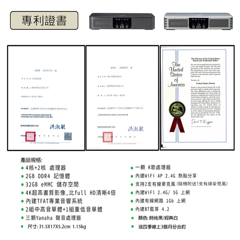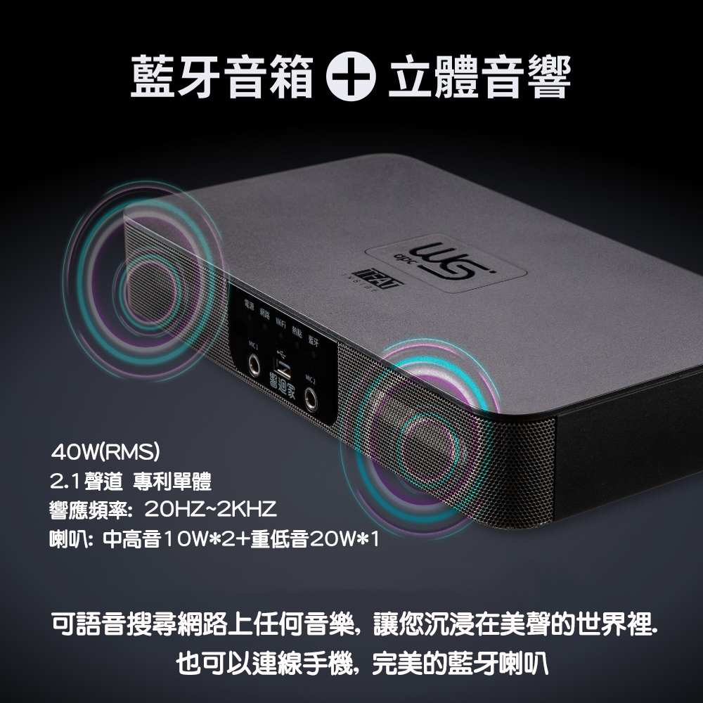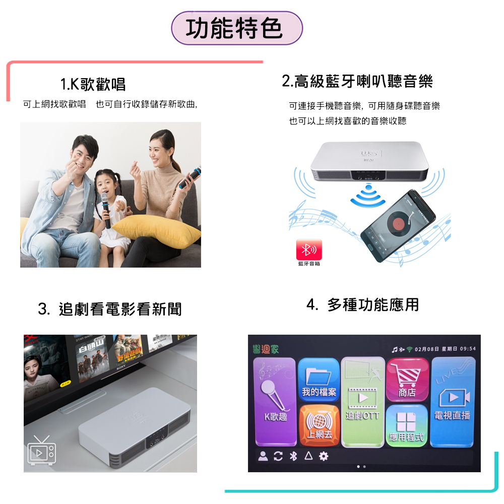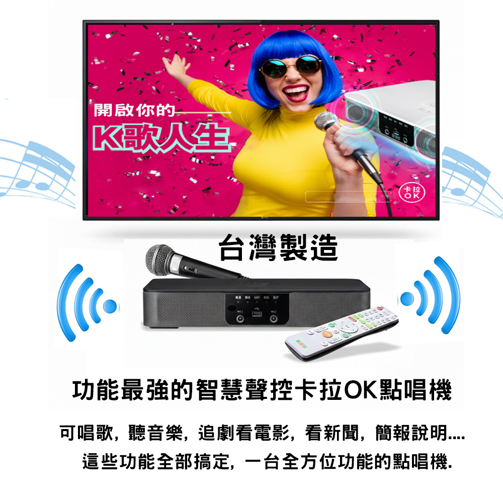 伴唱機 功能最強的智慧聲控卡拉OK點唱機 可唱歌, 聽音樂, 追劇看電影, 看新聞, 簡報說明.... 這些功能全部搞定, 一台全方位功能的點唱機. 功能說明: 1.K歌歡唱: 可上網找歌歡唱 也可自行收錄儲存新歌曲, 2.高級藍牙喇叭聽音樂:可連接手機聽音樂, 可用隨身碟聽音樂 也可以上網找喜歡的音樂收聽 3. 追劇看電影看新聞: 4. 其他多種功能應用: 簡報說明 全新功能, 目前市面還沒有一台這種全功能的點唱機 |